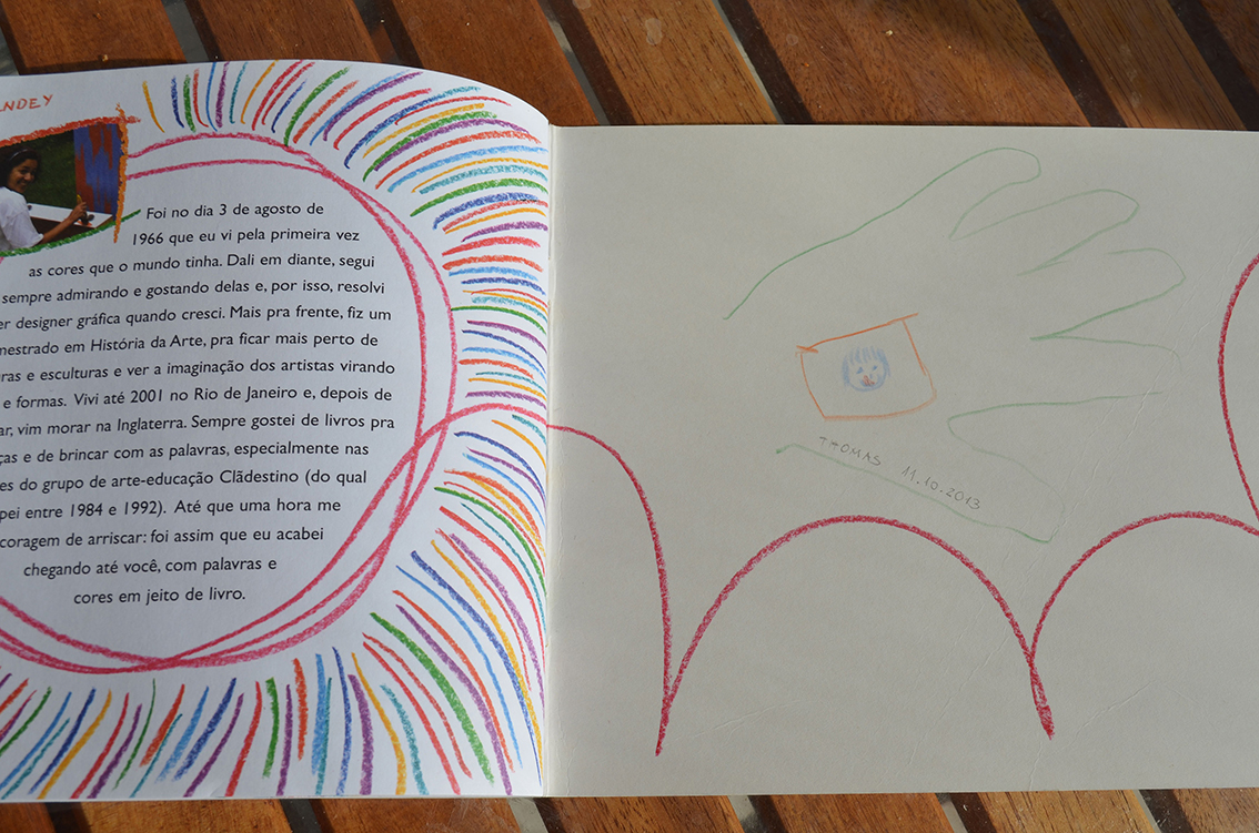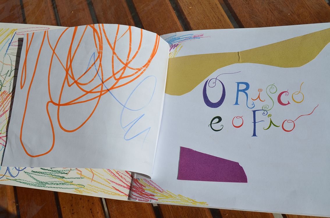 Um dia, o Thomas pegou “O Risco e o Fio” dele e me perguntou: “Mãe, pode desenhar nesse livro?”. Eu respondi: “Claro!”, feliz com o efeito de contágio. E ele se empolgou mesmo com a ideia de ser coautor do livro, quis até acrescentar páginas e no final tinha que ter a foto dele. Desenhou uma caixa como a da minha foto e me pediu pra desenhar ele dentro, com a língua de fora, não me perguntem por quê.