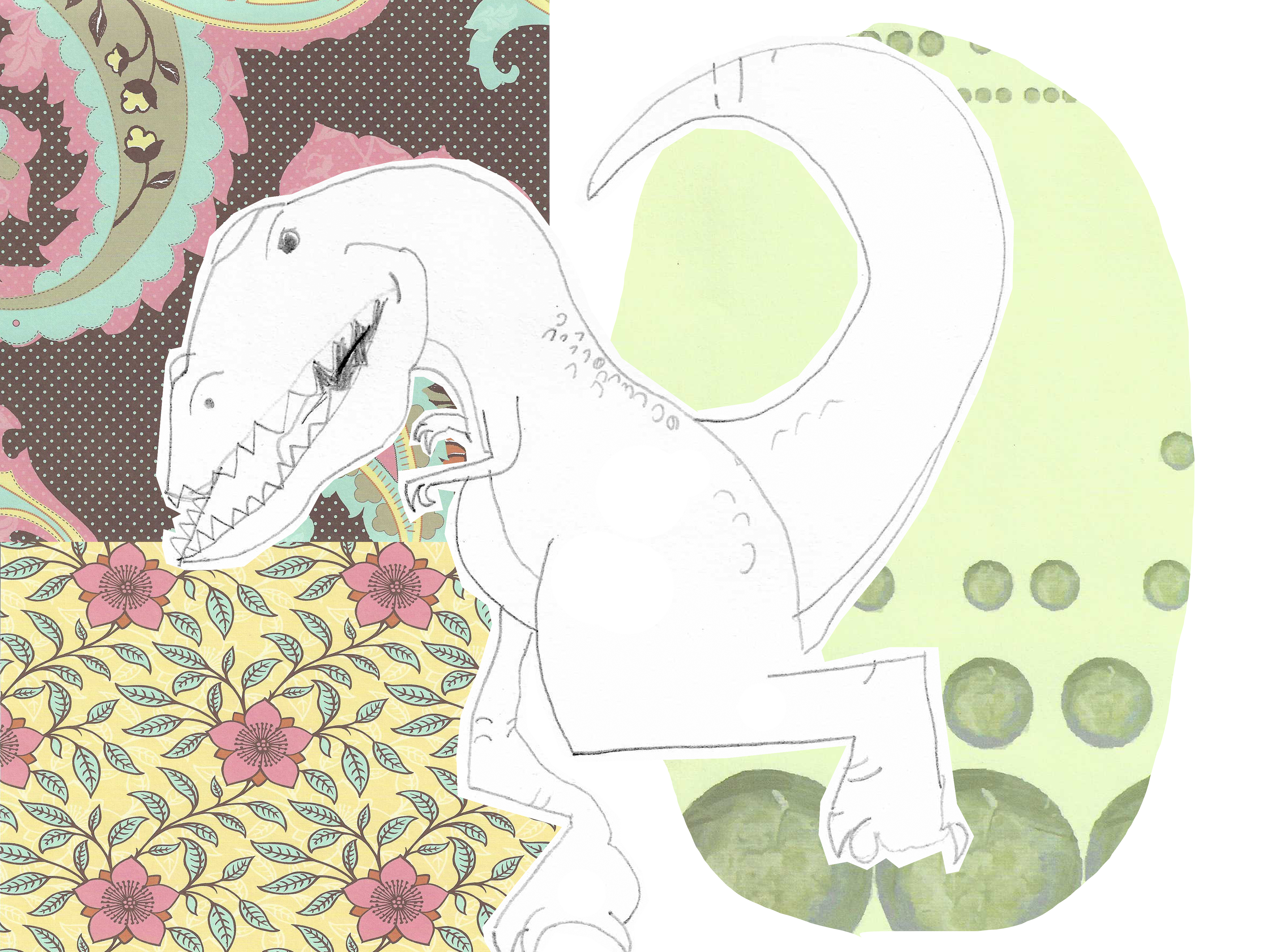Era um bebê dinossauro. Era só um bebê, mas já tinha patas enormes com garras enormes e uma cabeça enorme com uma boca enorme. Ele olhou pras flores, abriu a boca enorme, e as flores se apavoraram com aqueles dentes enormes. Aí ele falou, com uma voz miúda: “Que que são essas coisinhas coloridas no chão? Que que é esse cheirinho bom?” E foi chegando mais perto das flores, pra cheirar.