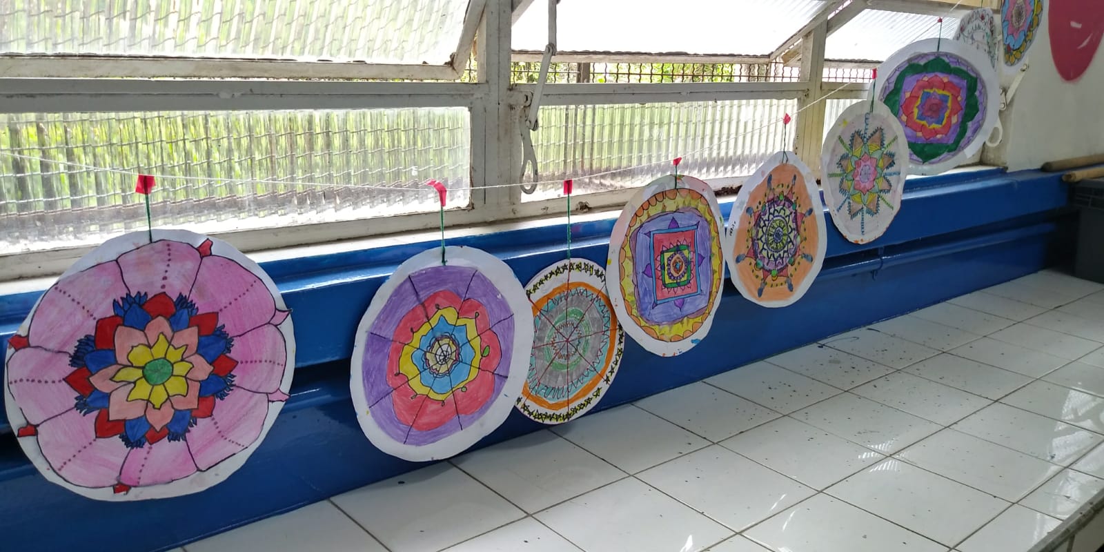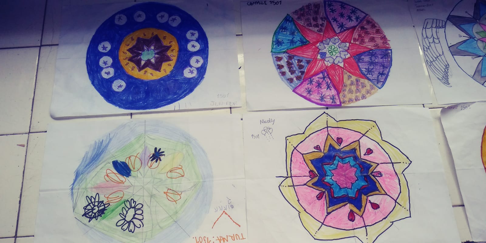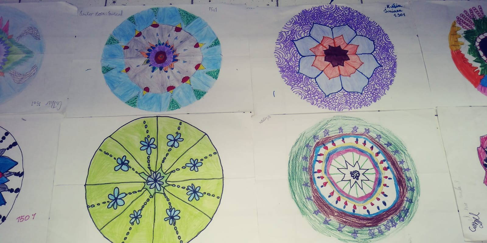 Depois apresentei as mandalas da artista Alessandra Prandi, mostrando seu processo de criação. A partir daí, as crianças começaram a fazer as suas próprias. Achavam o meio do papel, dobrando-o, eu fazia um círculo com compasso, eles marcavam uma cruz e um xis com a régua, dividindo em 8 “fatias”, e então começavam as camadas de desenho da mandala.